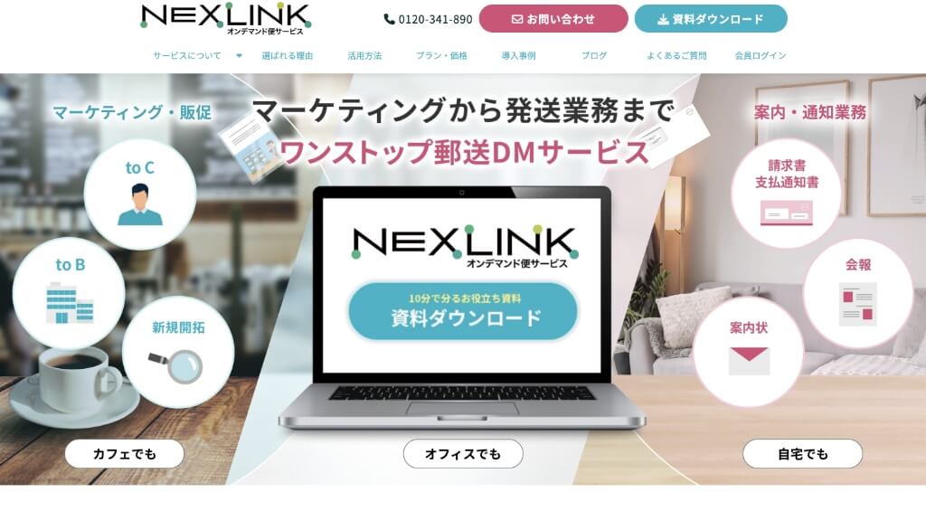 「NEXLINKオンデマンド便サービス」はパソコンから簡単操作で郵送DMを発送できるサービスです。1〜30,000通に対応しており、業界最安級の値段で発送することができます。