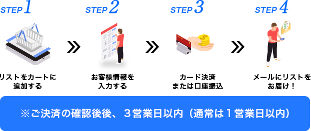 A.通常のECサイトのように、業種別のリストを定額で販売しております。ご入金確認後、ご入力されたメールアドレスあてにリストをお送りいたします。(土日祝日はお休みです。データの送付は人力となりますため決済日から3営業日(通常は1営業日以内)かかることをご了承ください。