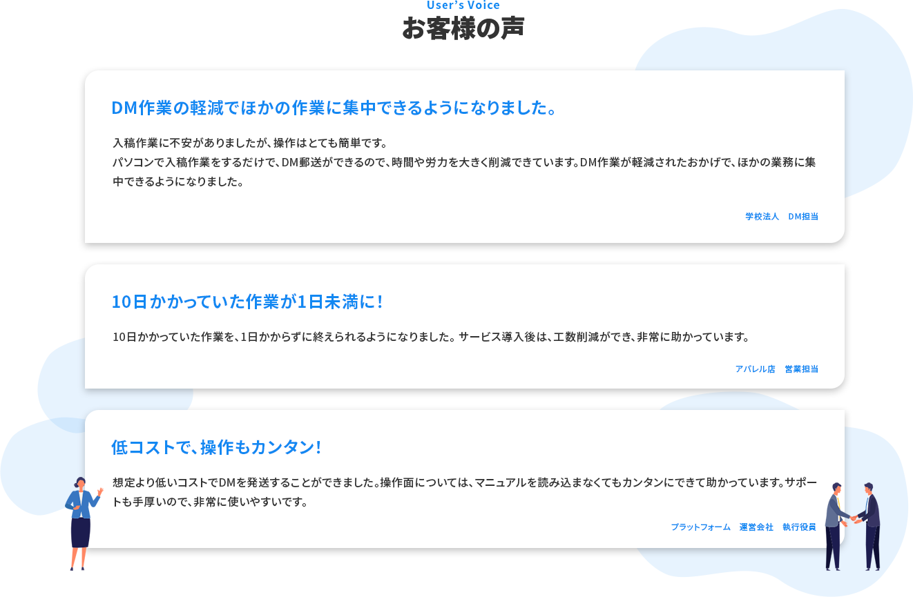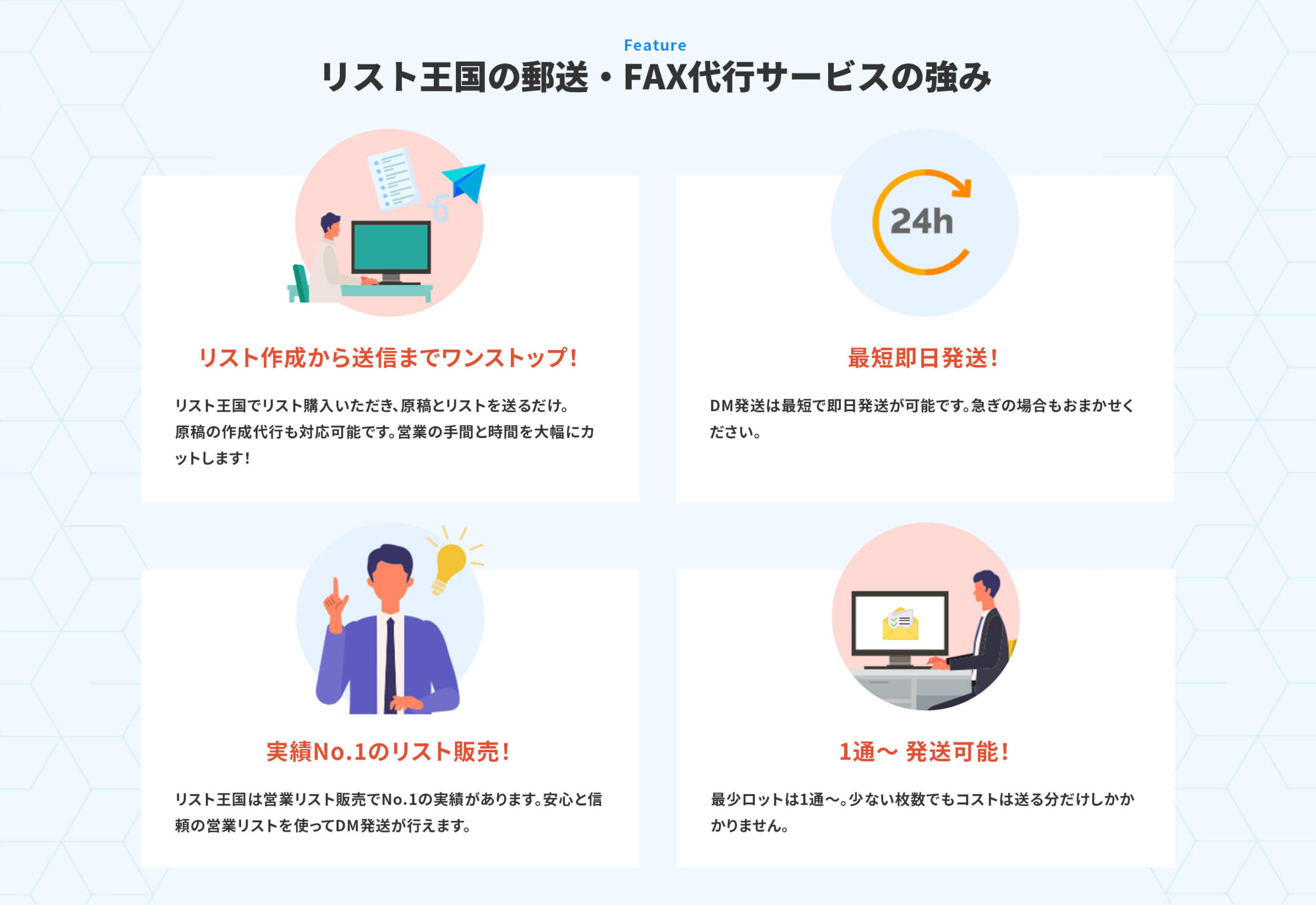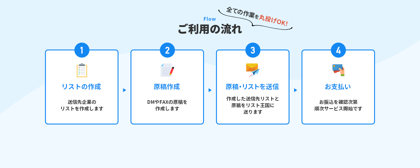 送信は弊社で行いますので、送信先リストと原稿を弊社に送っていただければ他にすることは特にございません。